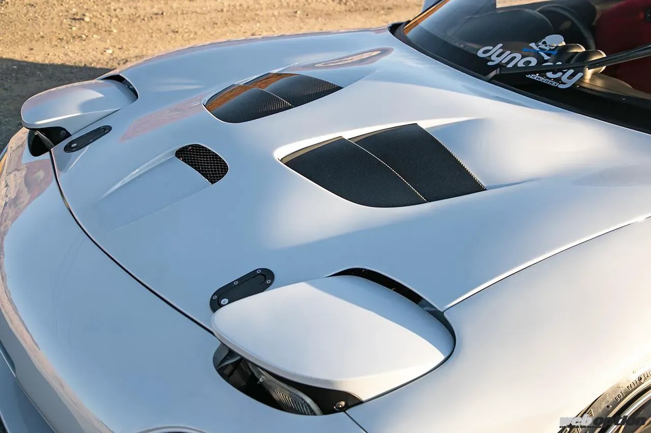 エクステリアは、フジタエンジニアリングのFEEDワイドボディキットを装着。フロントにはカーボン製のカナードとボンネットが追加され、「バンパーがスカスカして見えるのが嫌」という理由から採用したGReddyの前置きインタークーラーと相まってアグレッシブな外観を生み出している。ボンネットはSEIBON製だ。