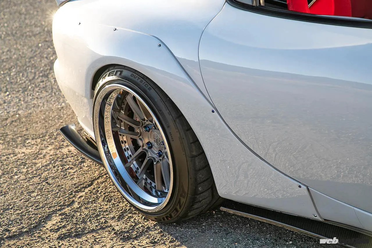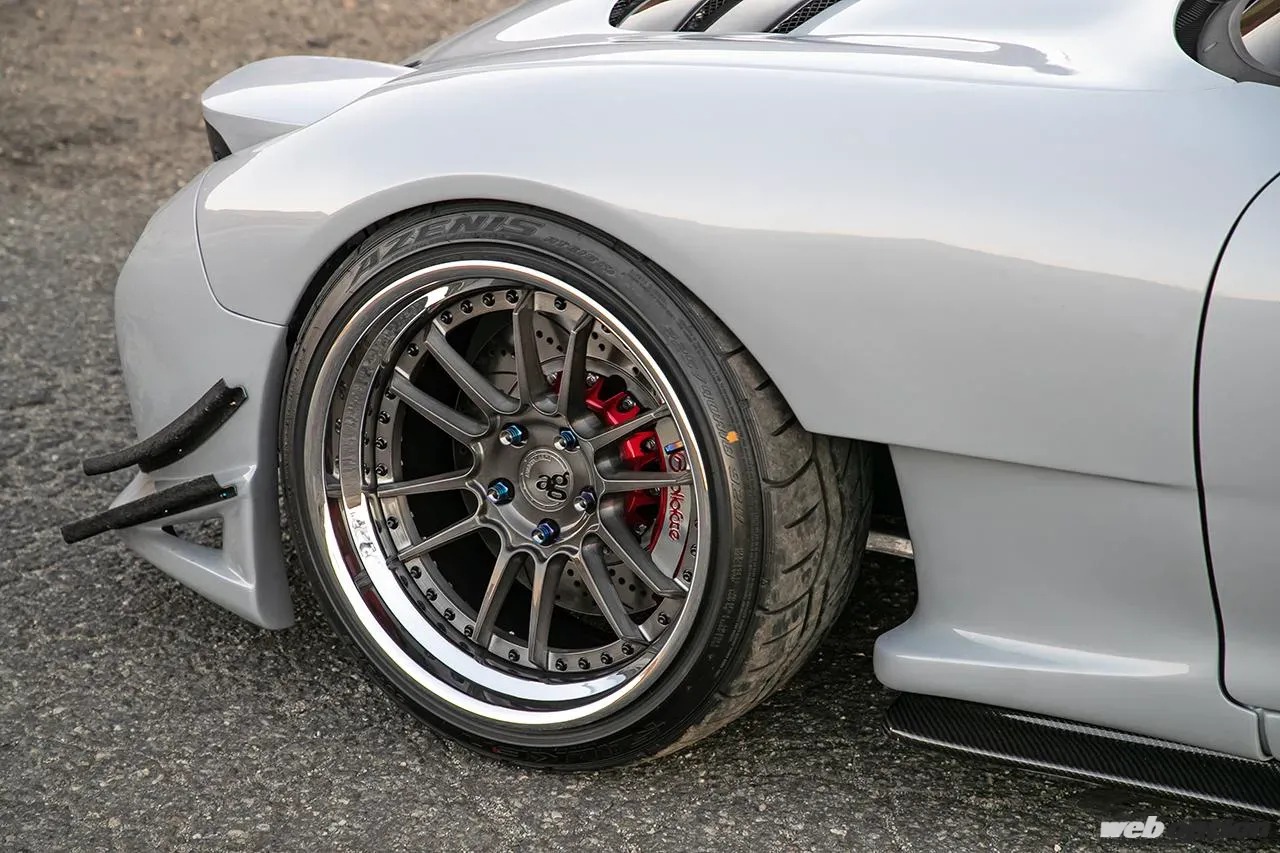 ホイールには、アメリカ鍛造ブランドのagホイールが展開する3ピースモデルのSR8(F10.0J×18+19 R12.0J×18+0)を装着。ディスクの表面処理およびカラーはブラッシュド・グリージョで、クロームリムと組み合わせる。