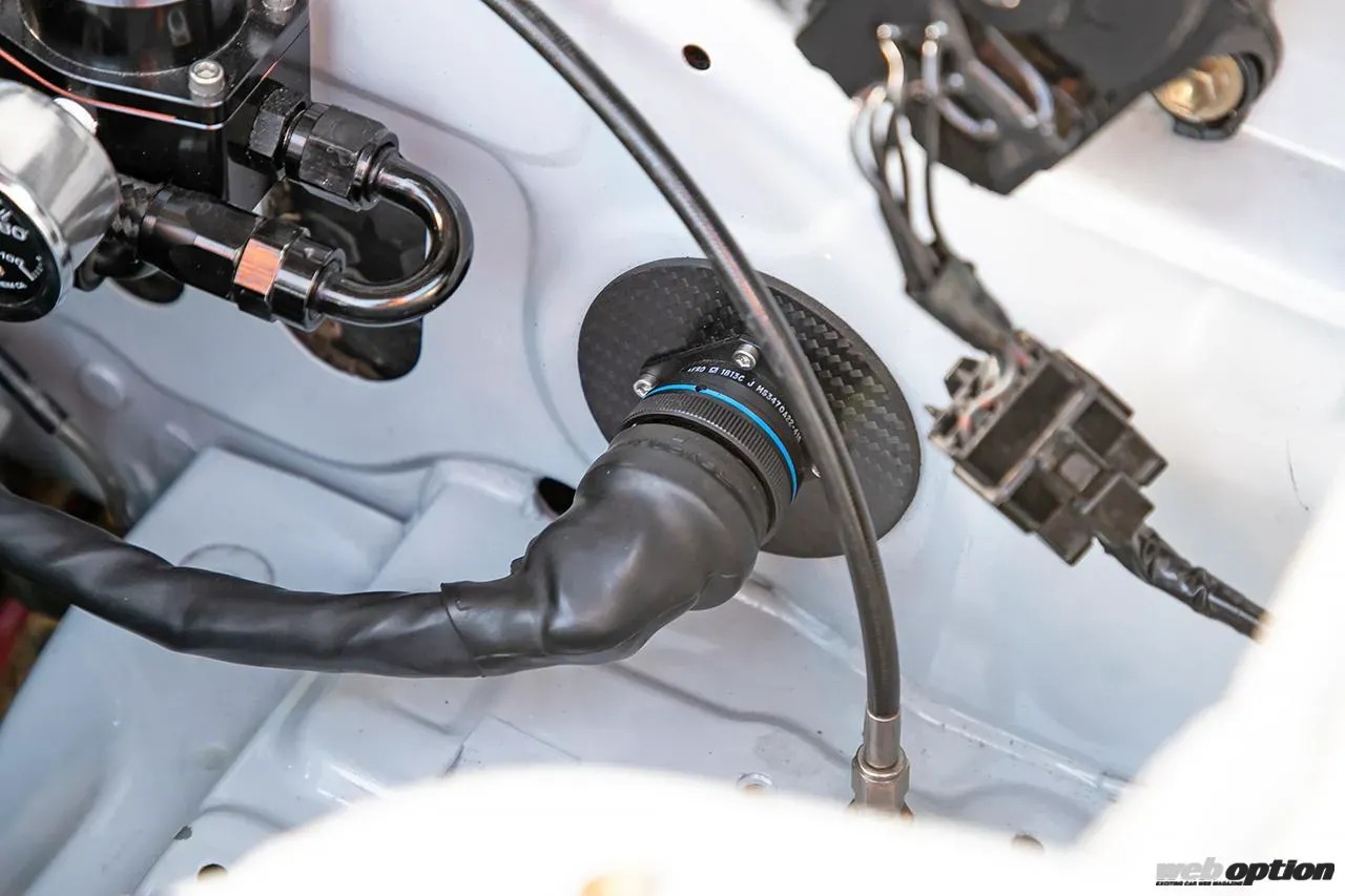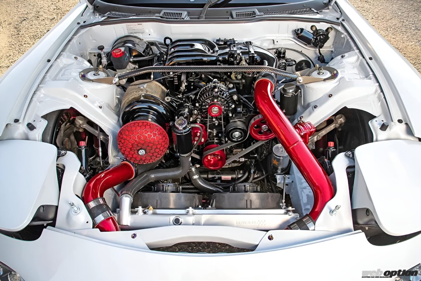 スティーブは人一倍こだわりの強いドンの要望に応え、ボルグワーナーS363SXEタービンの装着に合わせて、前置きインタークーラーを採用したオリジナルの吸排気レイアウトを構築。HKSやブリッツなど適材適所で日本製パーツを採り入れ、ハルテックのフルコンと繋ぐワイヤーハーネスはミルスペックで製作した。