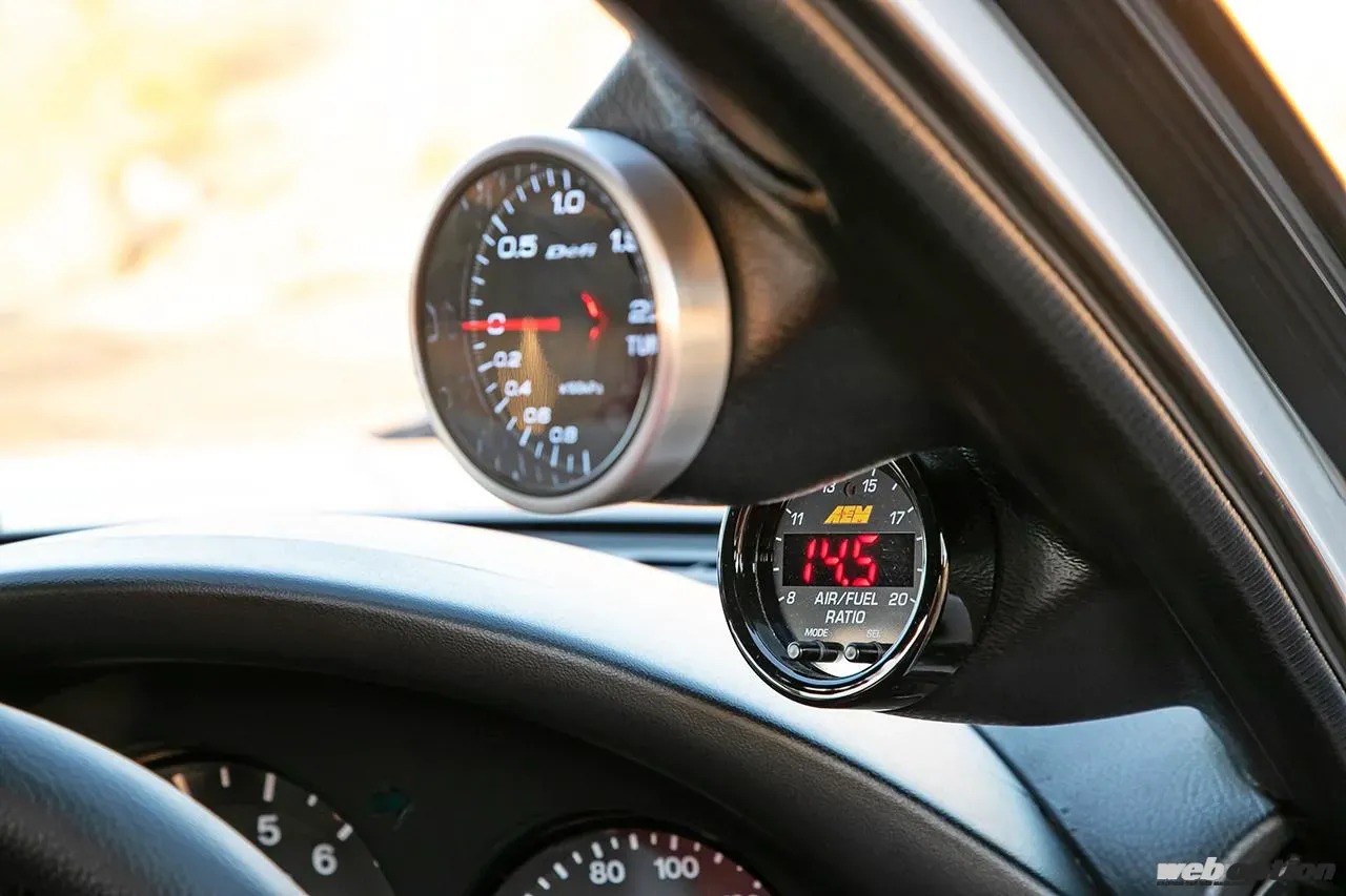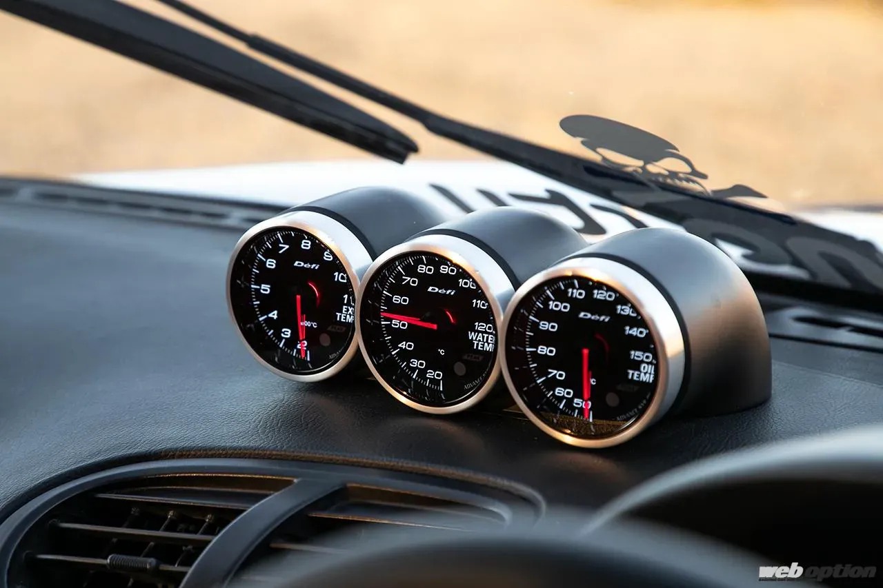 室内では、何と言っても“右ハンドル”というのが最大の特徴。Defiの三連メーター(油温、水温、排気温)をダッシュ中央に追加し、ブースト計とAEMの空燃比計をピラーに埋め込んでコクピット感が強調されている。