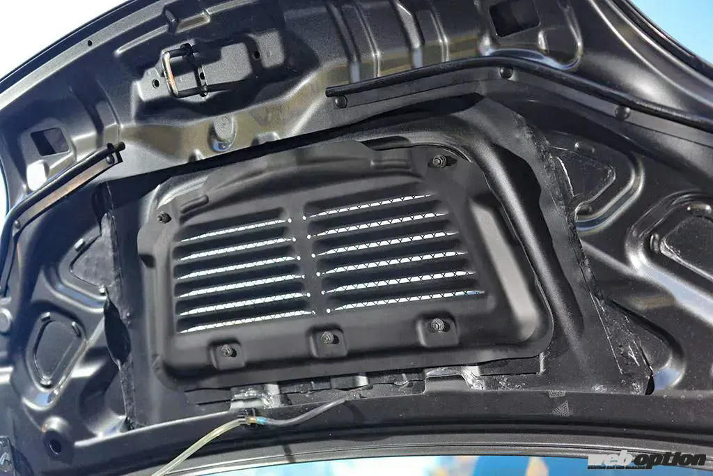 ターボエンジン化によってエンジンルームの熱量が増えるため、その対策として三菱コルトターボ純正のダクトを加工流用。まるで市販品のようなクオリティだ。