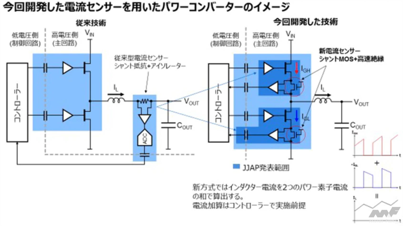 近年、カーボンニュートラルに向けた世界的な省エネの潮流が高まっていることを背景に、パワーエレクトロニクス機器の高効率化を追求する動きが加速している。また、その動きは様々な用途にわたっており、システムの小型化に対する要求も高まっている。従来、一般的な電源システムにおいては、HBモジュールと電流センサーがインダクターの両端にあることから、ワンパッケージに集積することは困難だった。また、電流検出用のシャント抵抗が使われていることから、電力消費(発熱)を抑えようとすると電流検出精度も低下してしまい、低損失かつ高精度な電流センサーを実現することが困難だった。
