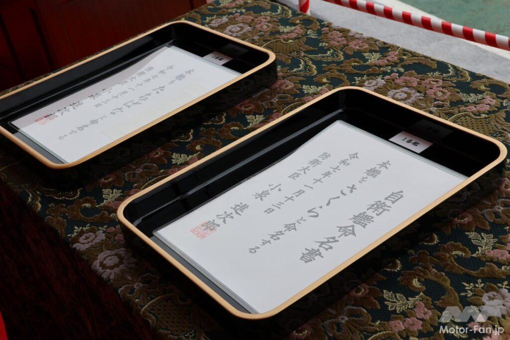 「さくら」と「たちばな」の命名書。両艦の名前は、京都御所紫宸殿の庭を飾る「左近の桜、右近の橘」にちなんだもの。三番艦以降も樹木に由来する名前が与えられる(写真/筆者)