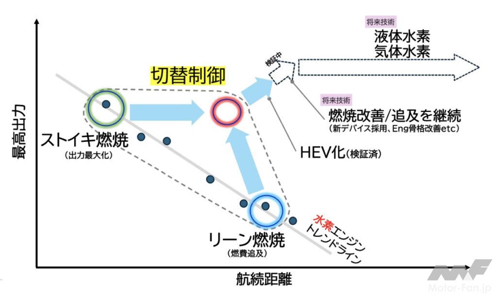 液体水素をエンジンで燃やす技術は確立している。2025年の富士24時間では高出力と低燃費を両立させる水素エンジン燃焼切換技術に挑戦。高出力が得られるストイキ燃焼(理論空燃比 λ=1)と低燃費を実現可能なリーン燃焼をドライバーの出力要求に合わせて切り換える技術だ。