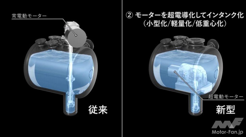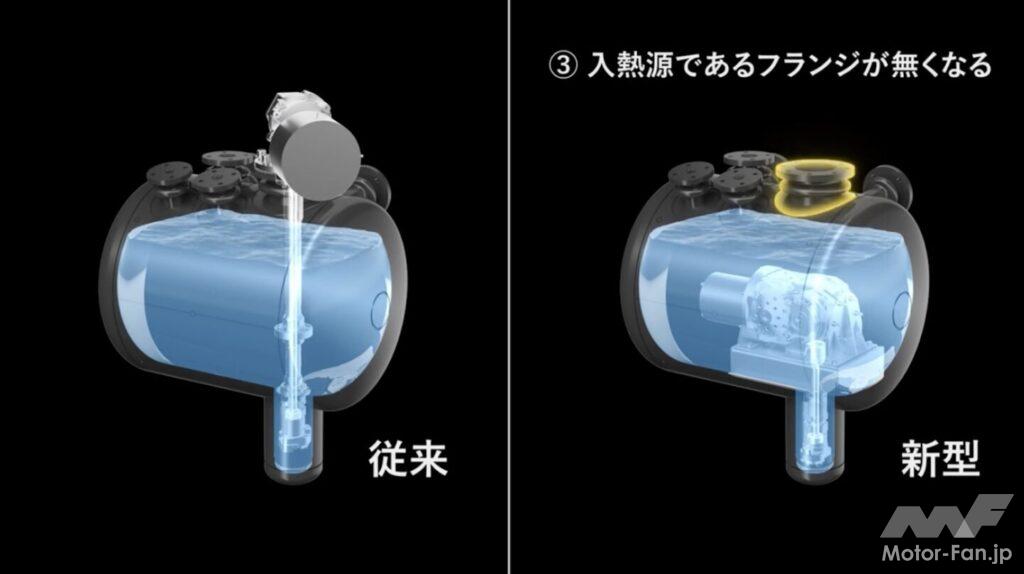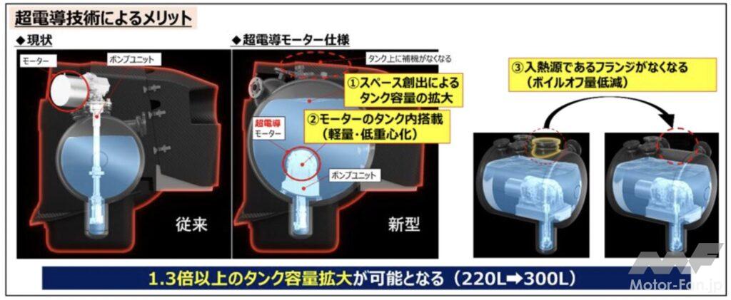 タンクの外にポンプを配置していた従来のレイアウトから超電導モーターで駆動するポンプをタンク内に収めることができると、スペース効率の向上でタンク容量を拡大できるほかにも、軽量・低重心化も実現できる。また、入熱源であるフランジがなくなることで、ボイルオフ(水素が気化すること)の量も低減できるという。