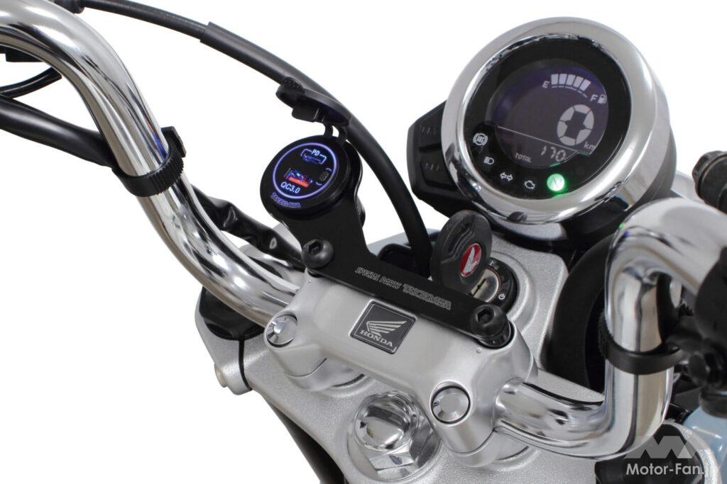 スマートフォン、タブレット、ナビゲーション、アクションカメラなどの電源や充電に使用できる 「シガーソケットタイプUSB電源」 に、コネクターハウジングと車両専用ステーキットを付属したモンキー125(JB03/JB05)、ダックス125専用セット。