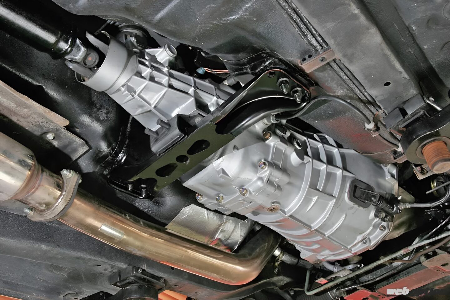 駆動系は、ニスモカッパーミックスツインクラッチにECR33純正5速MTという組み合わせ。パワー&トルクに対する強度や耐久性を向上させる他、シフトフィールも改善している。プロペラシャフトはワンオフ品だ。
