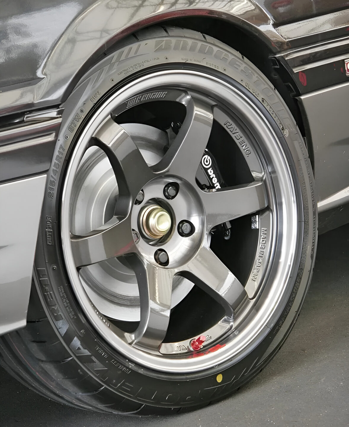 ホイールはボルクレーシングTE37SLで、フロント8.5Jオフセット+10、リヤ9.5Jオフセット+12という限定100本(25台分)のR31専用サイズ。5穴ハブ化が前提で、フロント215/45-17、リヤ245/40-17サイズのタイヤを組み合わせるとスペーサー無しでツライチを実現する。