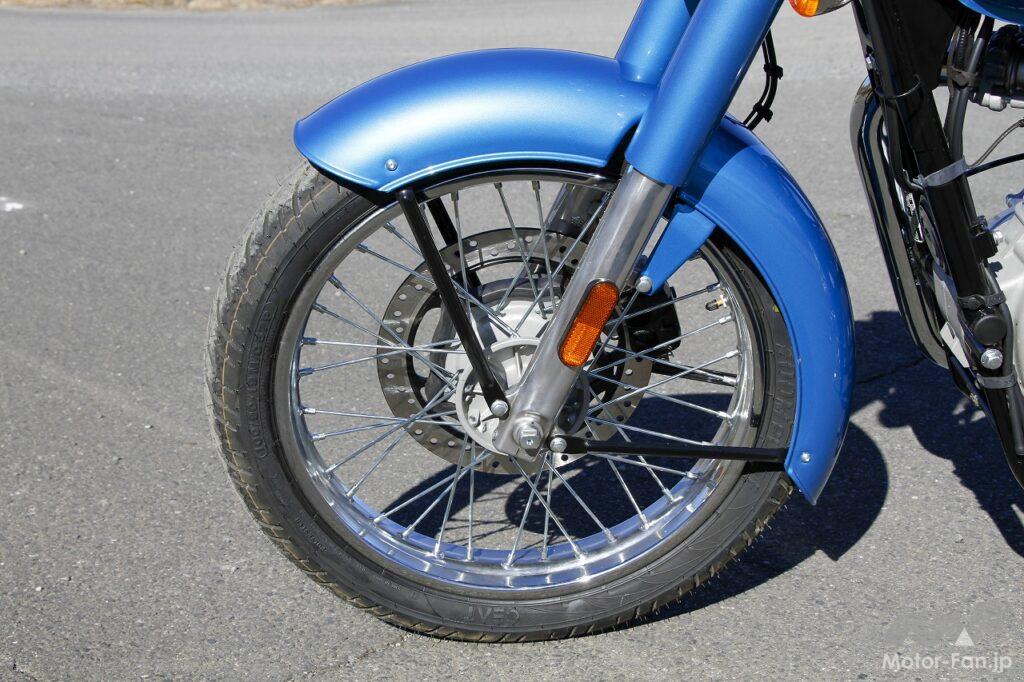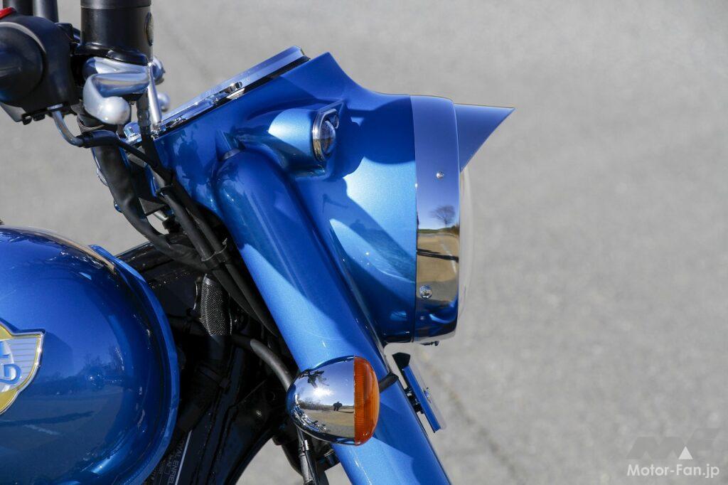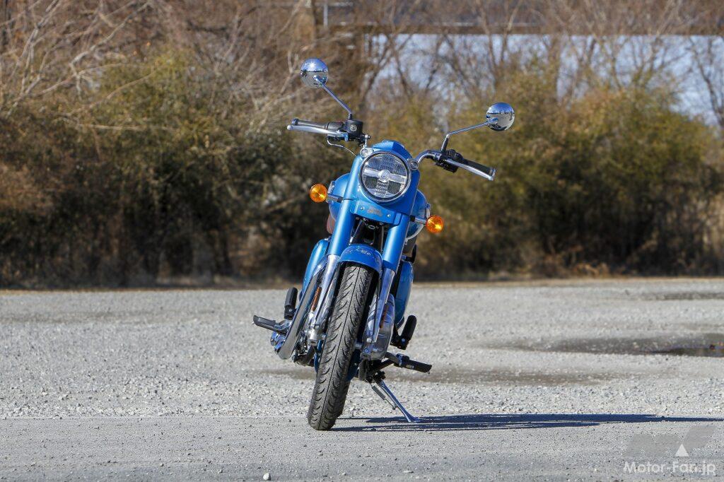 走り出してまず実感するのが、太い低中速トルクで車重を感じさせず加速していける点です。これはエンジン特性もありますが、車体バランスが良くてしっかりとした直進安定性を備えていることも大きな要因です。フロント19インチ、リア18インチというホイールサイズも高い安定性に寄与しているでしょう。一方でこうした車体構成はどちらかというと鈍重なハンドリングになりがちです。まあクラシックスタイルのこのバイクにはそのようなハンドリングが合っているような気もしますが、実際には軽快でニュートラルなハンドリング特性となっていて、旋回性も高いことに驚かされました。スポーティな走りが市街地やツーリングで楽しめるのです。
