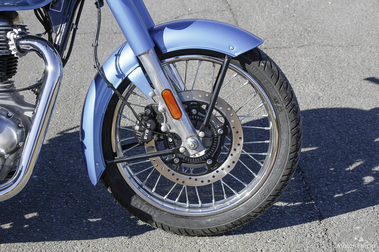 走り出してまず実感するのが、太い低中速トルクで車重を感じさせず加速していける点です。これはエンジン特性もありますが、車体バランスが良くてしっかりとした直進安定性を備えていることも大きな要因です。フロント19インチ、リア18インチというホイールサイズも高い安定性に寄与しているでしょう。一方でこうした車体構成はどちらかというと鈍重なハンドリングになりがちです。まあクラシックスタイルのこのバイクにはそのようなハンドリングが合っているような気もしますが、実際には軽快でニュートラルなハンドリング特性となっていて、旋回性も高いことに驚かされました。スポーティな走りが市街地やツーリングで楽しめるのです。