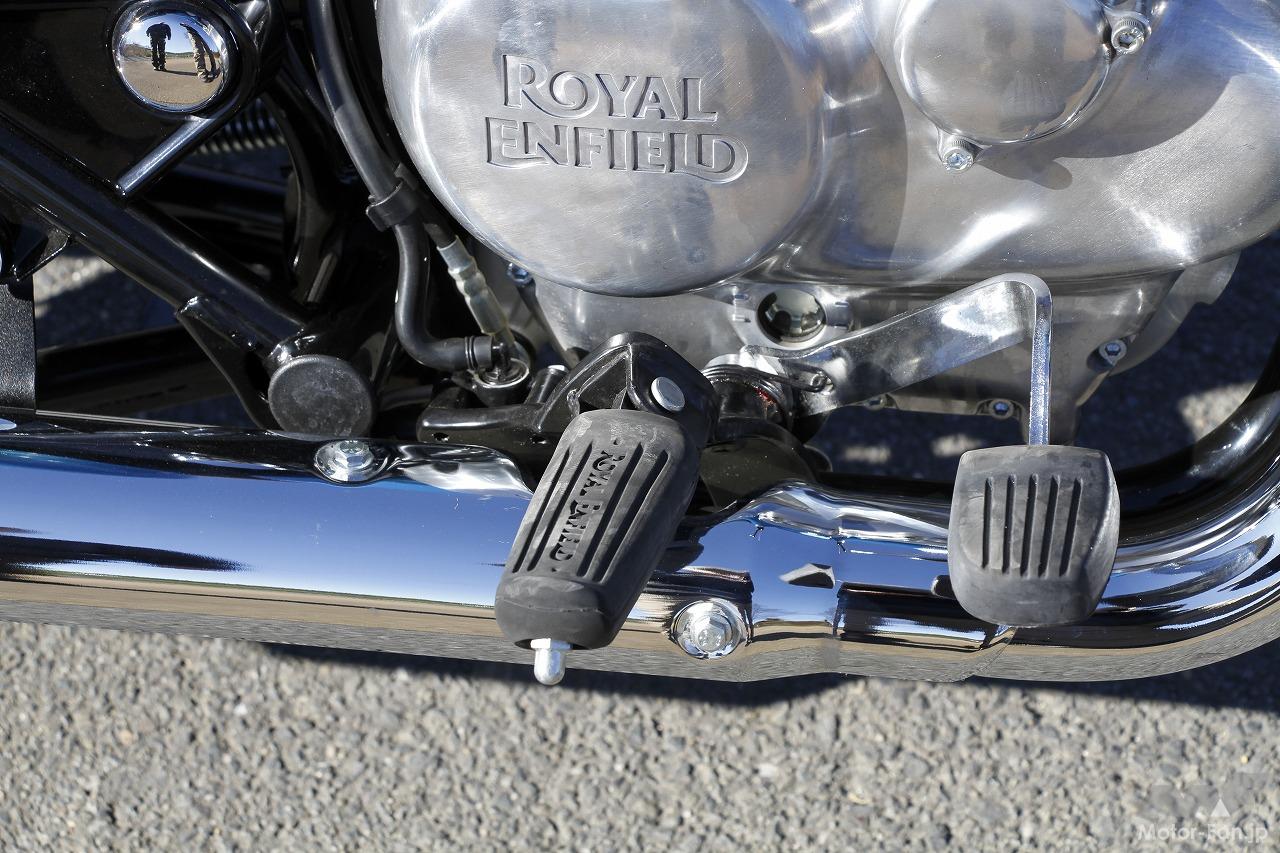空冷単気筒のシンプルなエンジンは最高出力14.9kW(20.2PS)/6,100rpm、最大トルク27Nm/4,000rpmという性能。ライバルであるGB350Cは最高出力15.0kW(20ps)/5,500rpm、最大トルク29Nm/3,000rpmなので性能面では大差はありません。低中速型であるのも同じです。ただクラシック350のパワーフィーリングには単気筒エンジンらしい鼓動感が強く出ていて、キャブトンタイプのマフラーから吐き出されるサウンドも大きくて歯切れが良いのが特徴的です。アクセルを開けたときにタタタッと鼓動とともに反応するので、走らせているという実感が得られます。実際のスピードは決して速くないのですが、自分のコントロール下において操作している喜びのほうが勝ります。