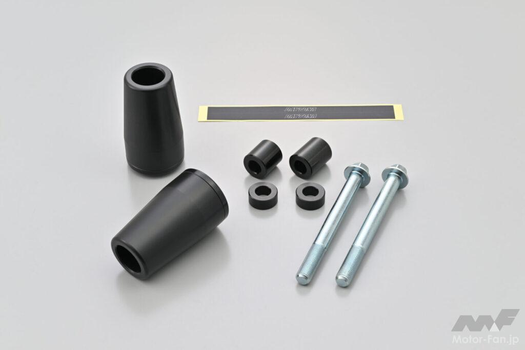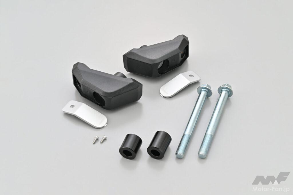 樹脂製パッドが転倒時のダメージを吸収し、マシンへのダメージを緩和。流線形パッドとアルミプレートの組み合わせで機能とドレスアップ効果を両立。 ◎意匠登録 No.1762940