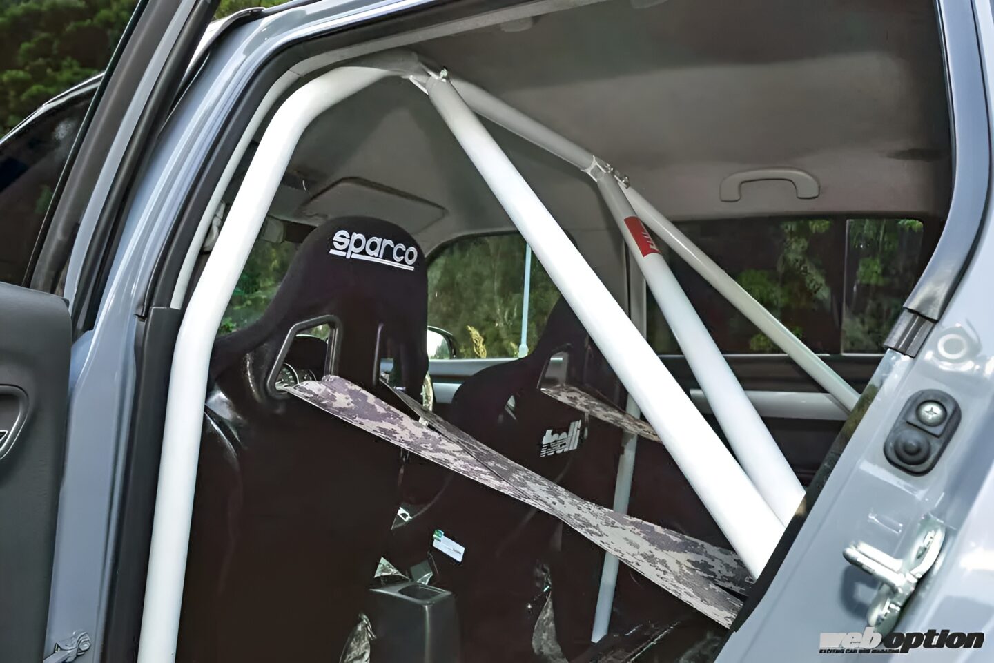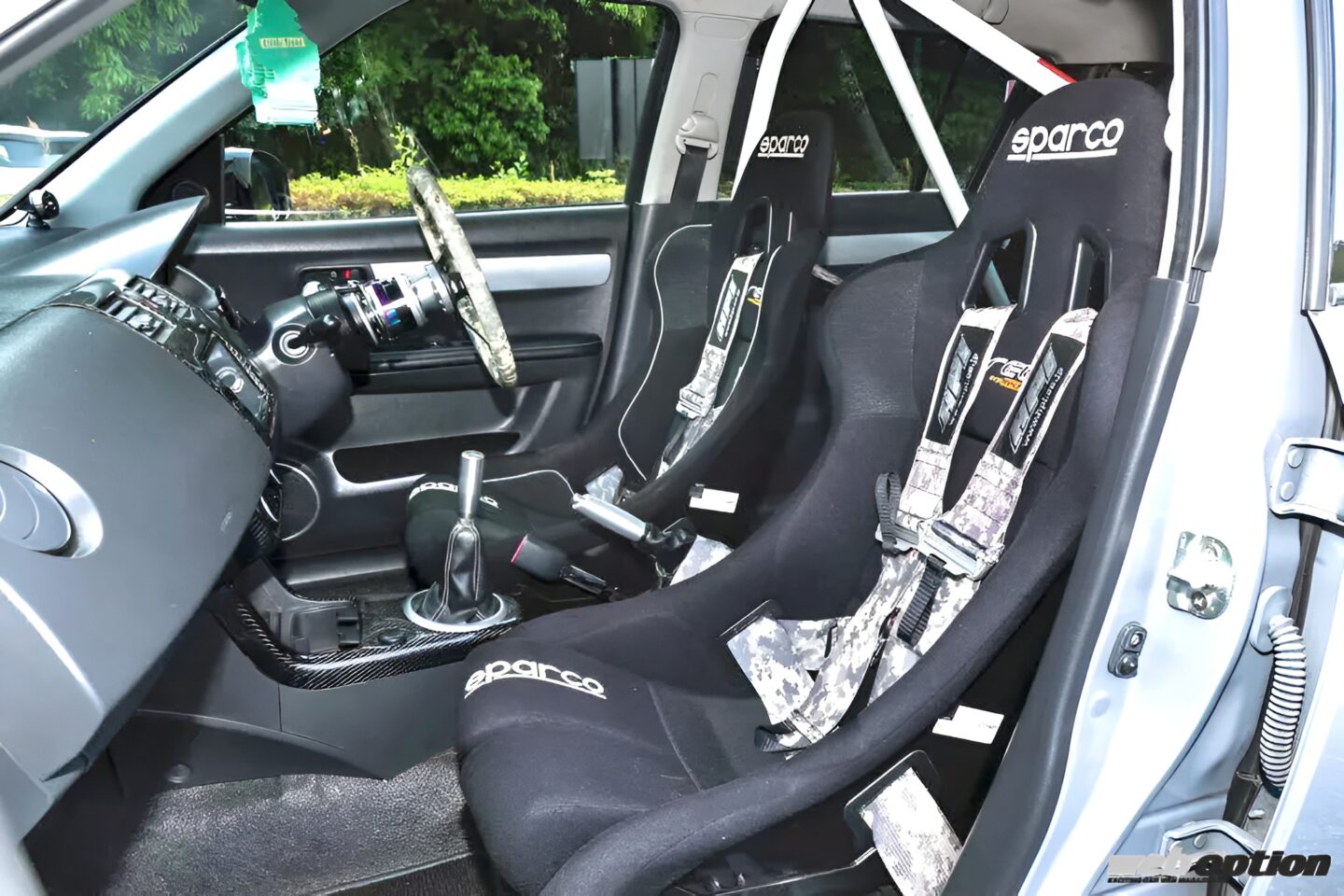 フルバケットのスパルコREVを2脚装着した他、迷彩柄の4点ハーネスも備わる。このままでサーキット走行もこなすという話も頷ける光景。
