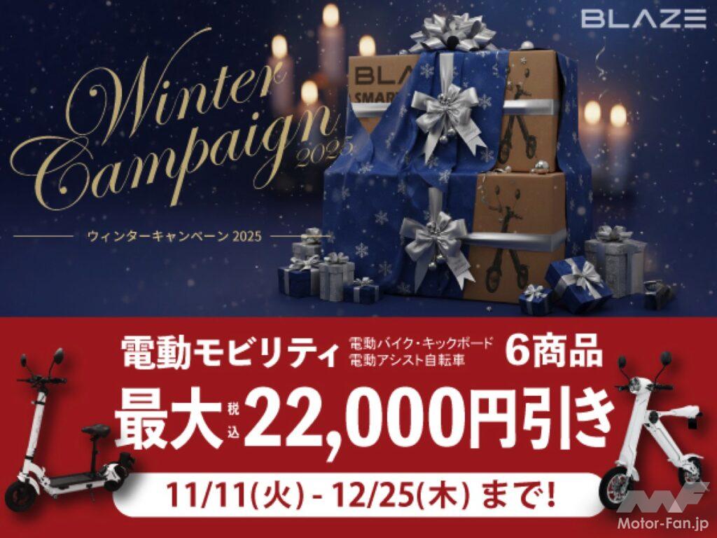 ブレイズは、2025年11月11日から12月25日まで、2輪電動モビリティを対象に最大2万2000円割引の「電動モビリティ ウィンターキャンペーン」を実施する。対象車種は、極太タイヤの電動アシスト自転車「スタイル e-バイク」、電動キックボード「キックボードEV ライトモデル」、またがるタイプの電動バイク「スマートEV 特定原付モデル」など。