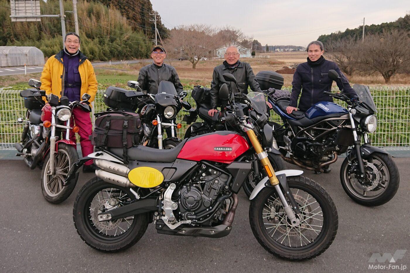 第1回目の最後に記したように、第2回目はキャバレロ・スクランブラー700の具体的な魅力を記すつもりなのだが、今回はいつもの当記事とは趣向を変えて、僕の古くからのツーリング仲間である、清本さん、本村さん、平川さん、池野上さんの言葉を主軸にして、インプレを展開したい。もちろん、広報車の又貸しは厳禁だから、僕以外のライダーが乗ることは事前に輸入元のモーターリストに申請済みで、試乗の方法はツーリングの途中で僕と交代して各人約1時間ずつ、という形で行った。