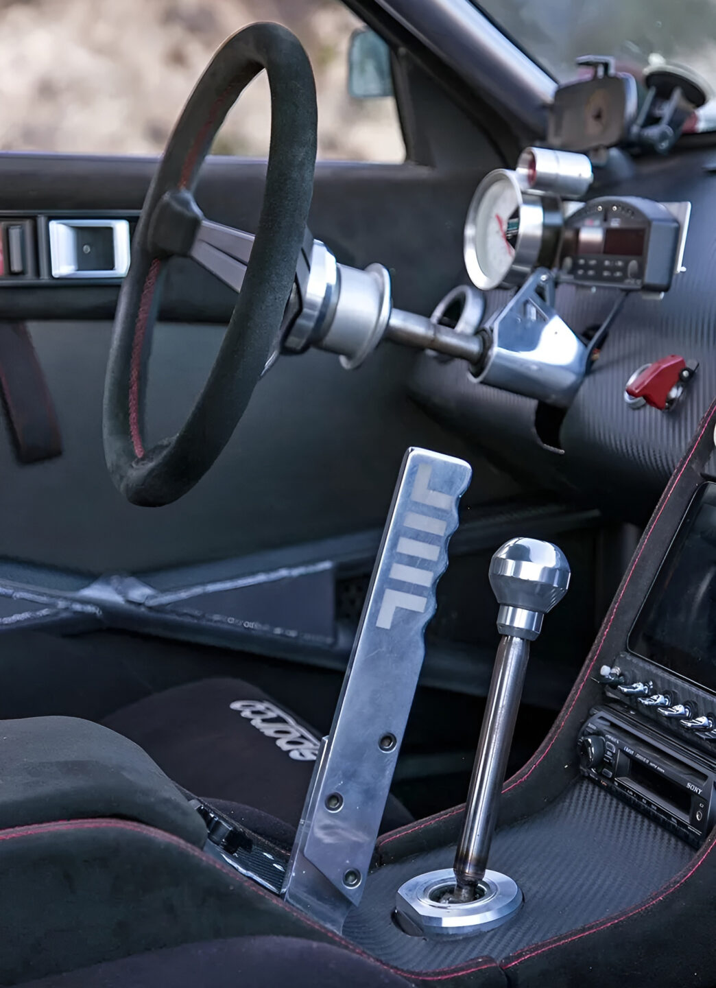 センターコンソールに収まるのはサムスンのタブレットPCで、『TORQUE』というアプリで各種走行データを表示する。油圧のハンドブレーキシステムもジョン自ら作製した。