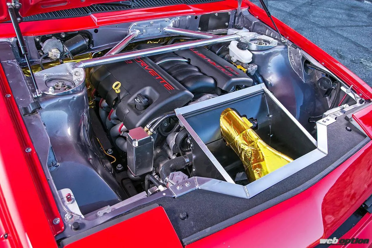 マネジメントにはPSI ConversionのLS3用スタンドアローンハーネスを使用。トランスミッションは現行カマロなどと同じ、トレメック製6速MTのTR6060を採用する。エンジンとともに吸排気にはK&Nのカスタムインテークやジョン自作のEXマニを装備。各部の熱対策としてDEI製のゴールドヒートシールディングも施工された。