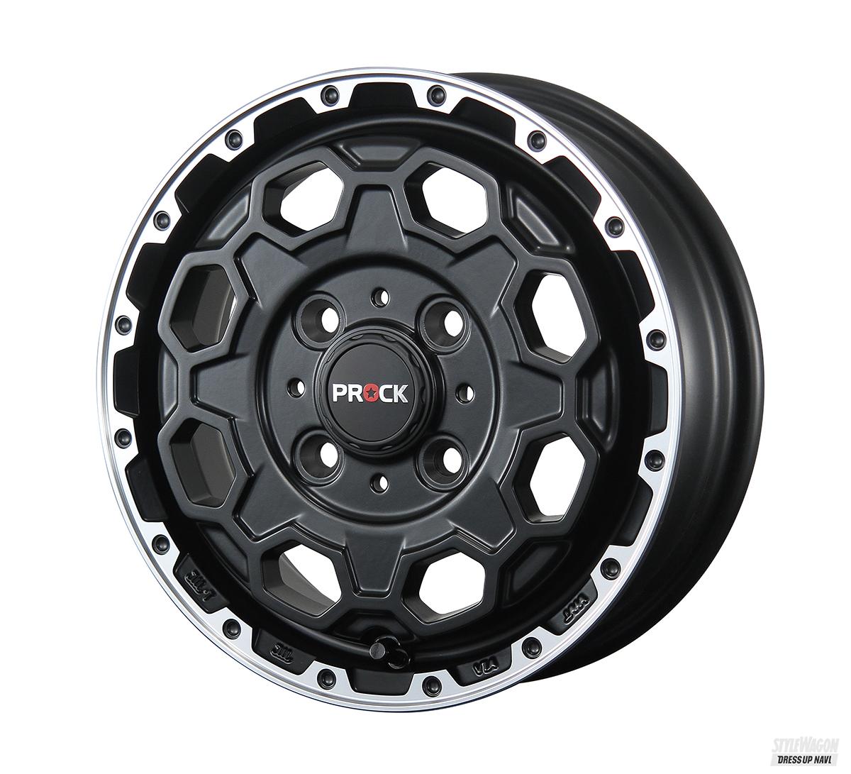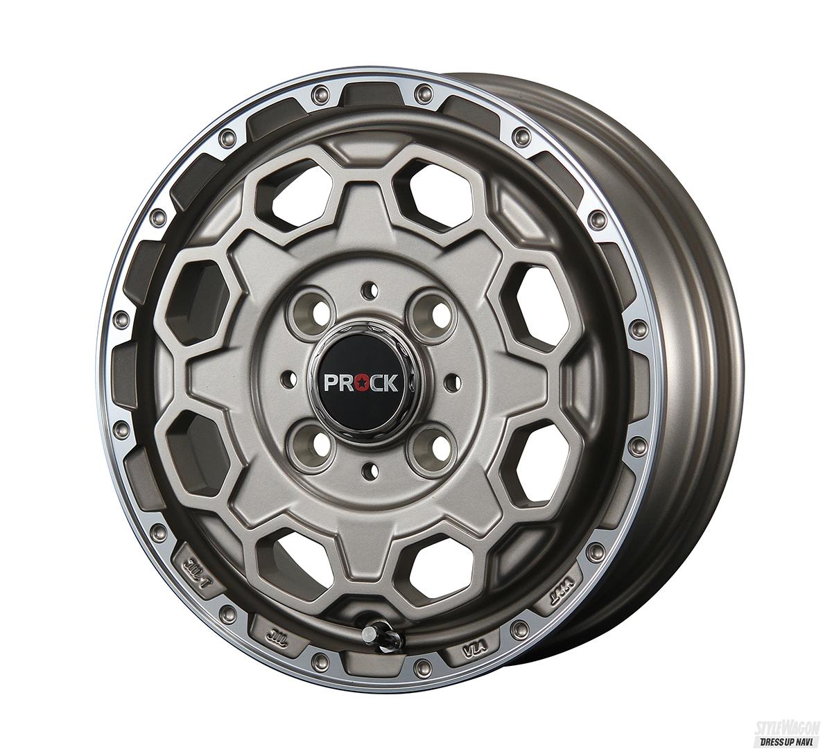 基本となるのは8ホールディッシュ。窓を定番の丸ではなく、カクカクとした六角形で描いているのがワイルドで、歯車のような形状となるセンターパートとの相乗効果によって、薫り立つメカニカル感がハンパない。ディスク自体もリムの深い位置から急角度で立ち上がるため、デザインの凹凸感とも相まって立体感がバツグン。軽トラ用サイズでも3D感がしっかりあり、リムもしっかり力強く見えるのはメリットだ。