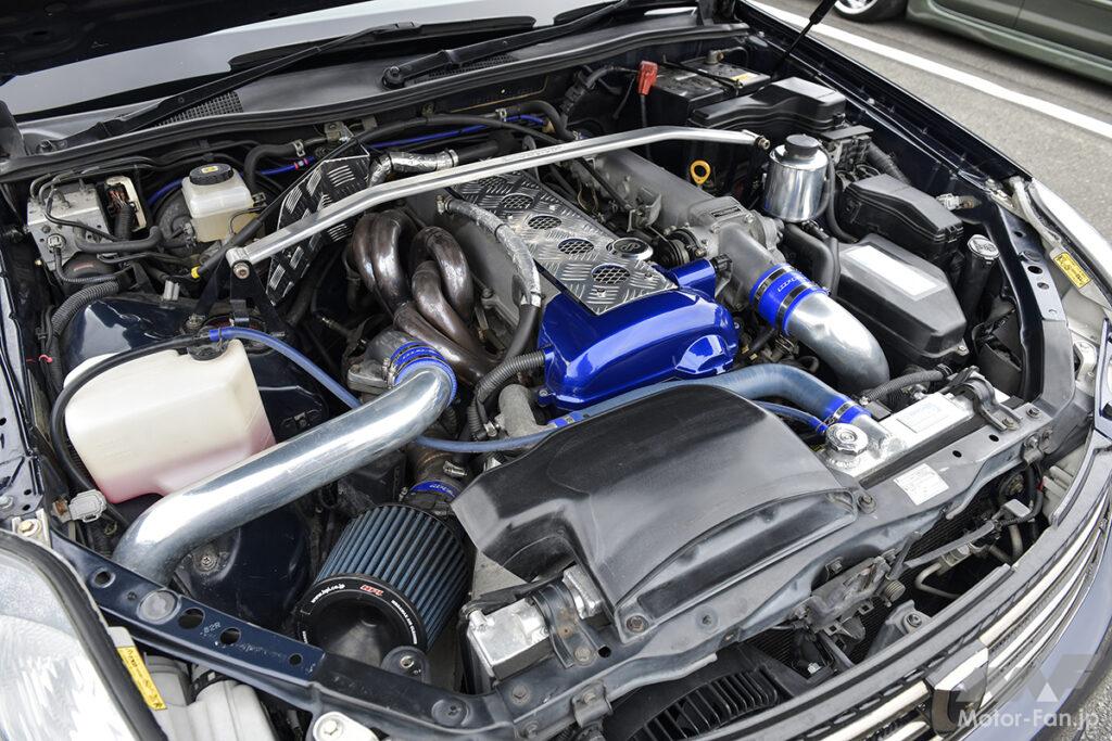若い頃はドリフトにハマッていたしのっちさんが、子どもが大きくなったのを機に選んだのがマークⅡブリット。何と言ってもチューニングパーツが多い名機1JZターボを搭載したグレードがあり、FR駆動で走りも楽しめることが決め手。もちろんオートマから5速マニュアルに載せ替え済みで、エンジンもタービンやインタークーラーの交換など抜かりなし。足まわりはラルグス車高調を組み、ハイレートのバネで強化。80スープラのブレーキを流用して制動力も文句なし。フェンダーのワイド化やホイールのリムポリッシュ加工など、オールペン以外は自分で仕上げたのも自慢のひとつ。ブルーアイのライトやフルLED加工したテールランプなど、光モノも力を入れる。