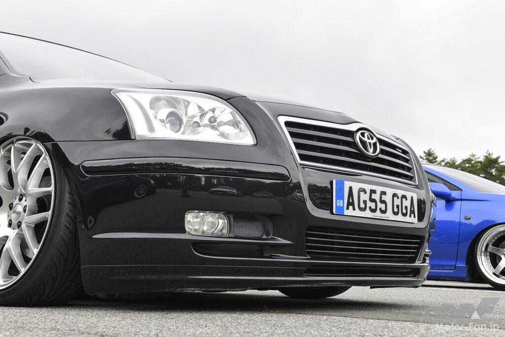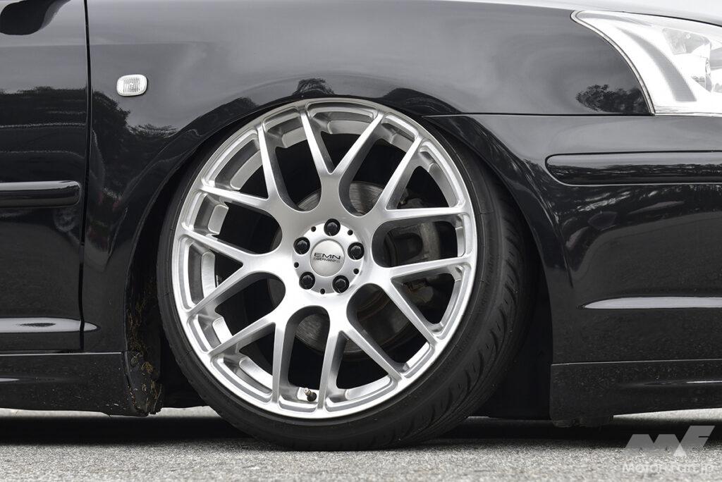 普段はほど良い車高でシンプルに乗っているというこくちゃんさんのアベンシスワゴン。今回イベントに参加するにあたり、さらに車高を落としてきた。ラルグス車高調はロックシートを抜き、リムが被るまでダウン。キャンバーボルトも入れてセッティングを煮詰めた。19インチのEMNジャーマニーがヨーロピアンなフォルムにマッチ。