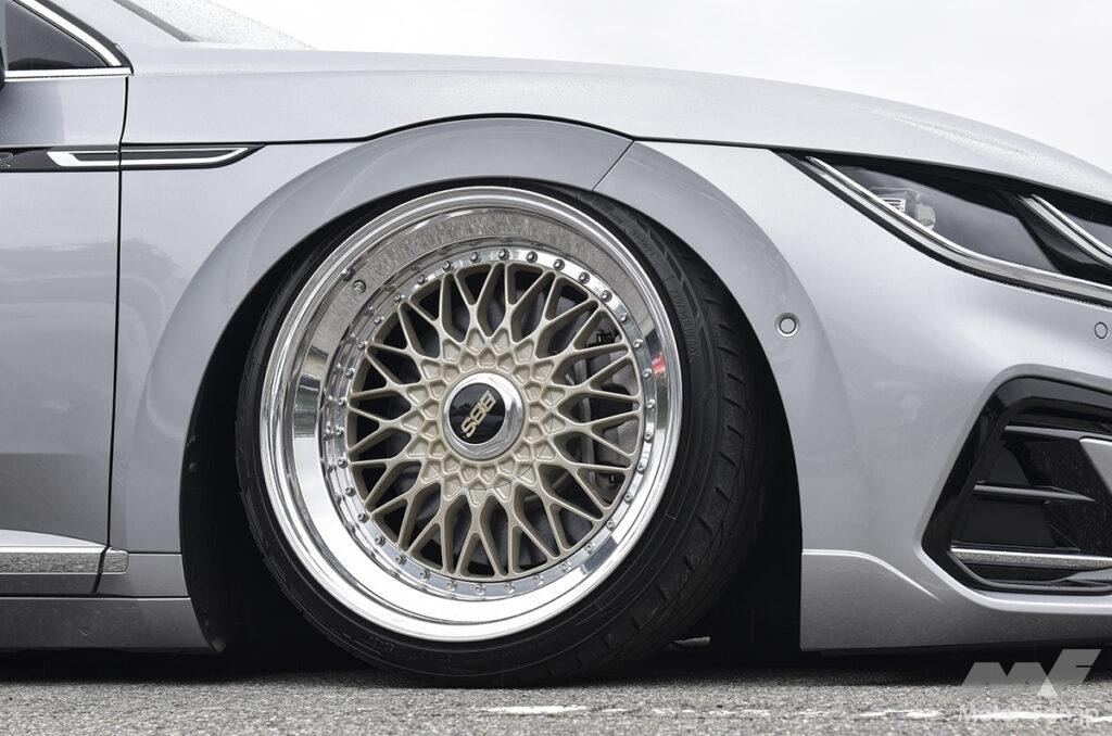 最近カスタムするユーザーが増えてきたアルテオンシューティングブレーク。イマイチさんが特に見て欲しいというポイントが足元メイク。BBSのスーパーRSはもともと18インチだが、リバレルして19インチにサイズアップ。ディスクは落ち着きのあるシャンパンゴールドでペイントしてアダルトにメイク。足まわりはエアメクストのエアサスを組み、フロントのブラケットを短縮してさらにダウン量を稼いだ。アームはTディメンド+純正加工。車高を落としてもホイールがセンターに来るように、キャスター角の補正にもこだわった。