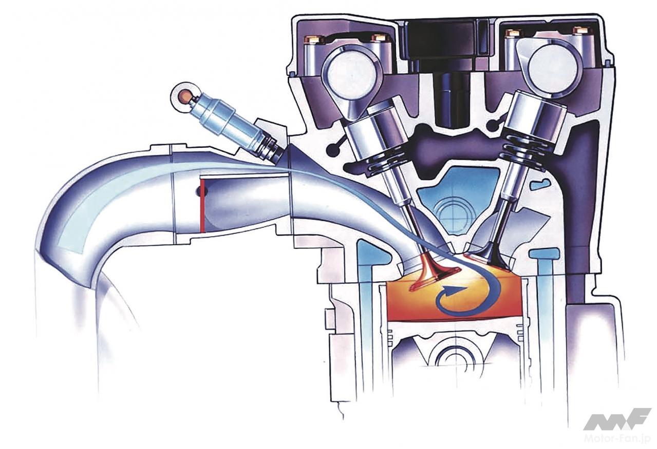 2バルブであれば特別な仕掛けがなくとも発生した流れも、DOHC4バルブ+ペントルーフ型燃焼室が標準化すると、ふたつの吸気ポートからの吸気同士が干渉してしまいスワールが期待できなくなった。そのため、吸気ポートからピストン頂部に向けて吸気を導き、その反転によって縦方向の流れ・タンブル流をいかに強く発生させるかが課題となったのである。タンブルはスワールと異なり、ピストンの上昇につれて渦が崩れるタンブル崩壊という現象が起きることから、積極的に流れを強くするために吸気ポートに可変フラップを設けたり、ポートをなるべく真っ直ぐに通す工夫が必要になってきている。昨今の4バルブエンジンのバルブ挟み角がどんどん浅くなっているのは、これが一因である。