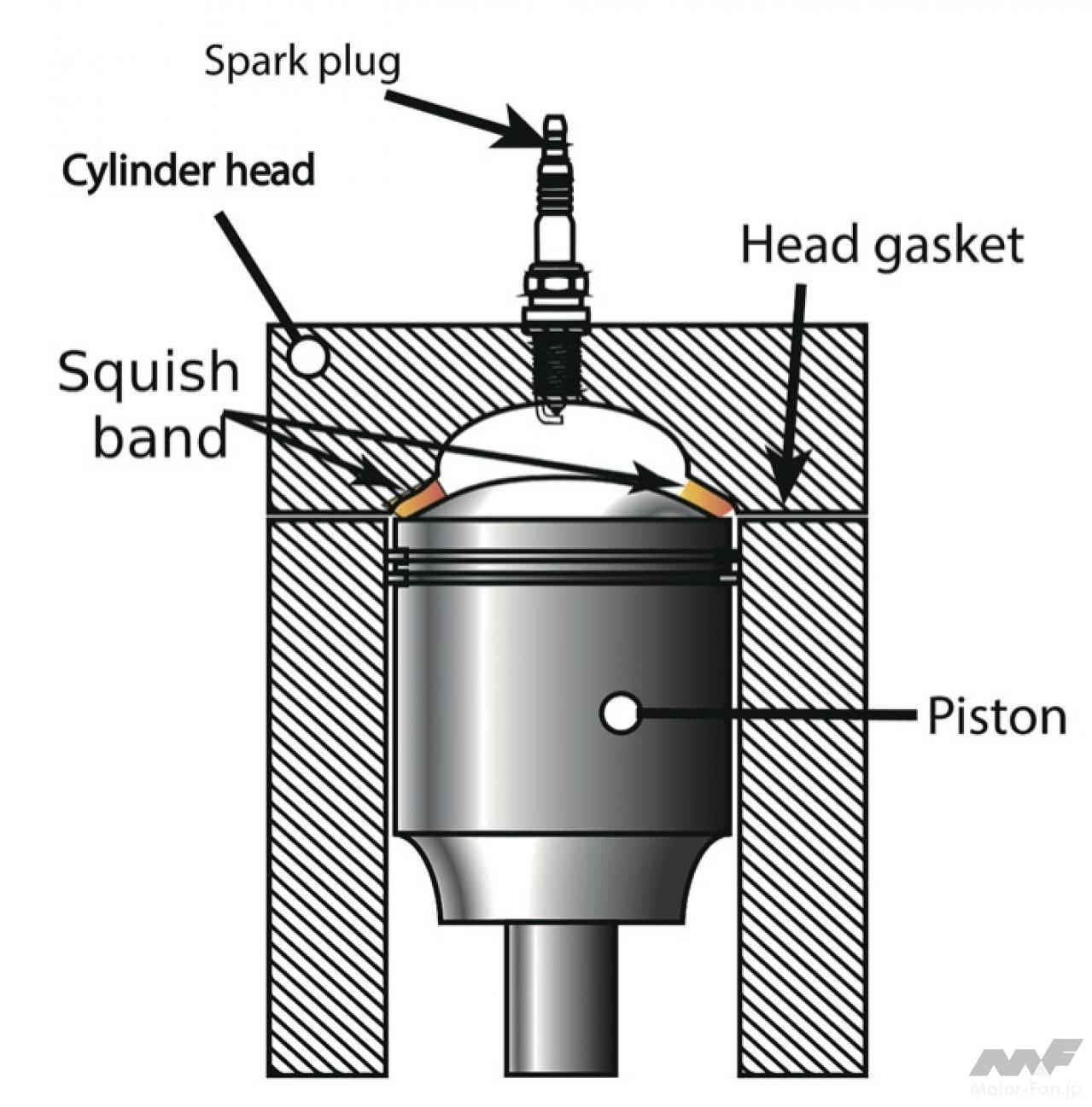 スキッシュエリア | 圧縮時にヘッドとピストンの隙間が挟くなって混合気が押しつぶされて乱流を起こすように設けられた、燃焼室の外縁部とピストンに挟まれた部分。