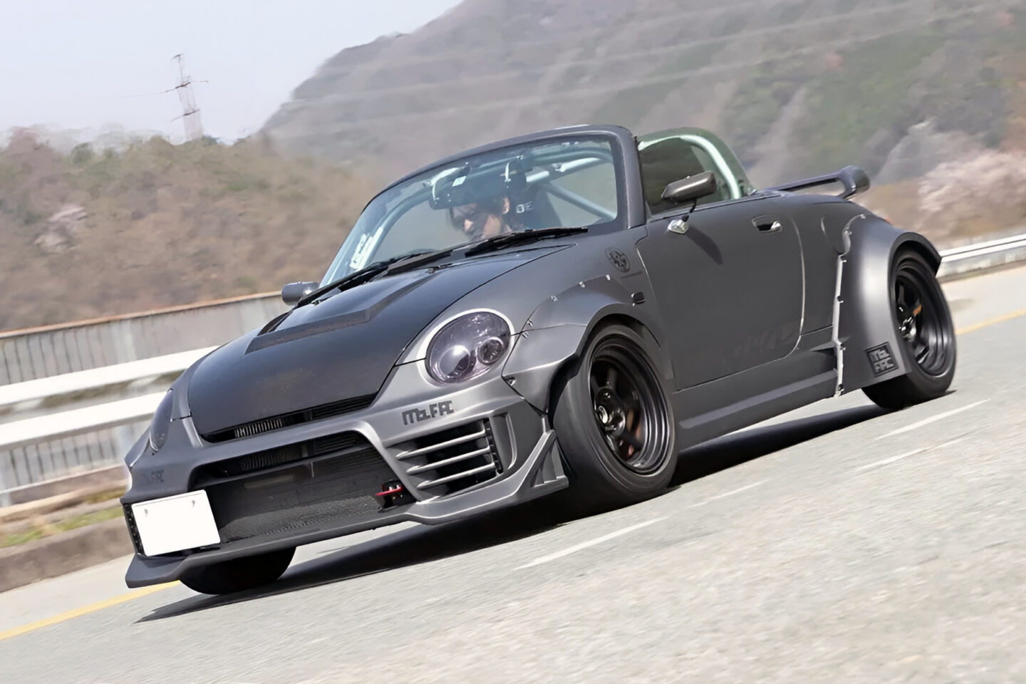 エクステリアの構成は同社のデモカーに近く、テイクオフ製の前後バンパーに片側120ミリワイドのオリジナルフェンダーをセット。大幅なワイドトレッド化によって、メカニカルグリップの向上を狙っているのだ。