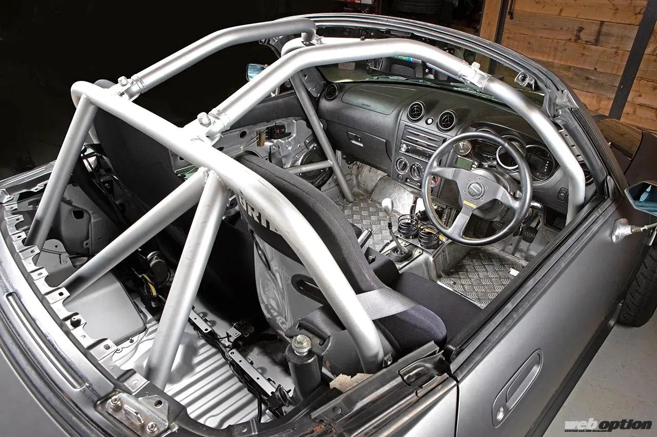乗員保護と同時に、オープンボディの剛性を補うためのロールケージはサイドバー付きの9点式。縞鋼板で作られたフットプレートまで含めて非常にレーサーな仕上がりだが、ドリンクホルダーや1DINオーディオ等の快適装備を残しているところにオーナーのストリート魂を感じてしまう。