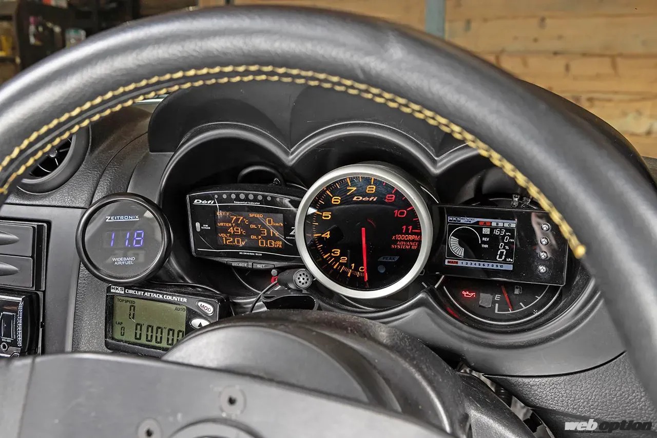 シンプルにまとめられたインテリアは、サーキット走行を楽しむためのストイックさの表れ。高回転化に合わせて、純正のメーターパネルの前には1万1000rpmスケールのタコメーターをセット。その周囲にはマルチメーターやラップタイマーも配備されている。