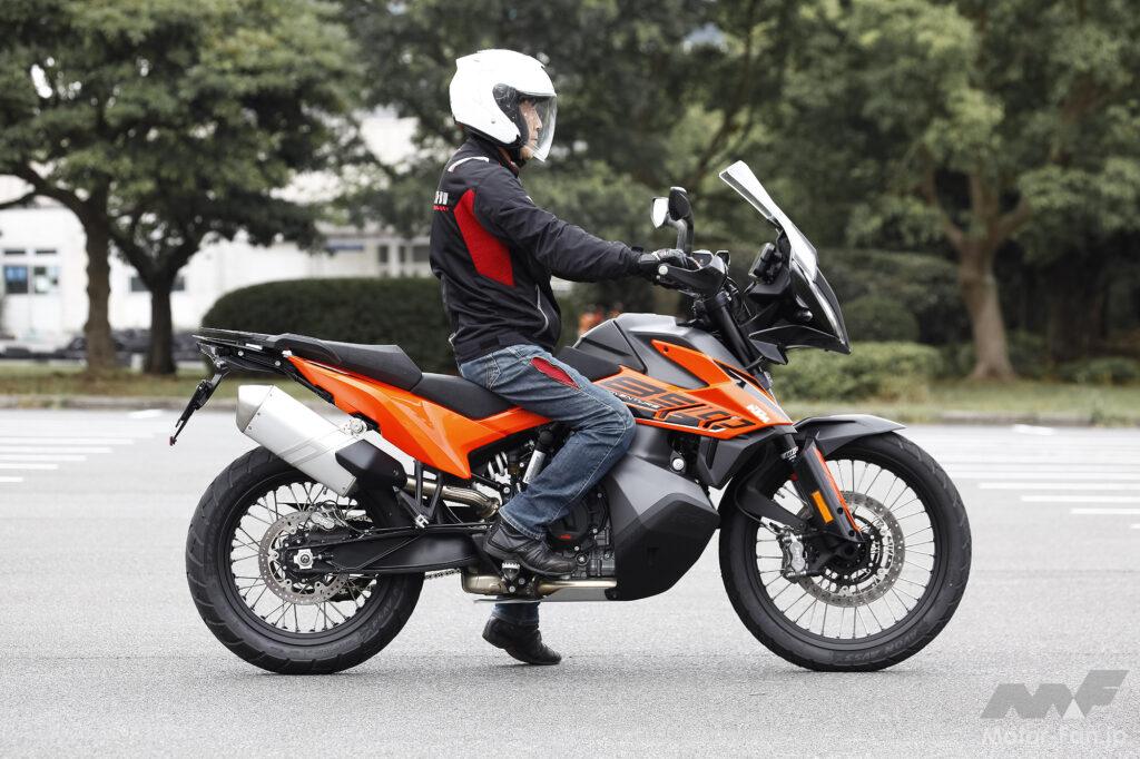 ただシート高は880mm。アドベンチャーは830mm。その50mm差は大きく、背筋や足の関節をピンと精一杯伸ばしてギリギリの爪先立ち。足つき性チェックの写真をご覧頂ければ理解は早いだろう。