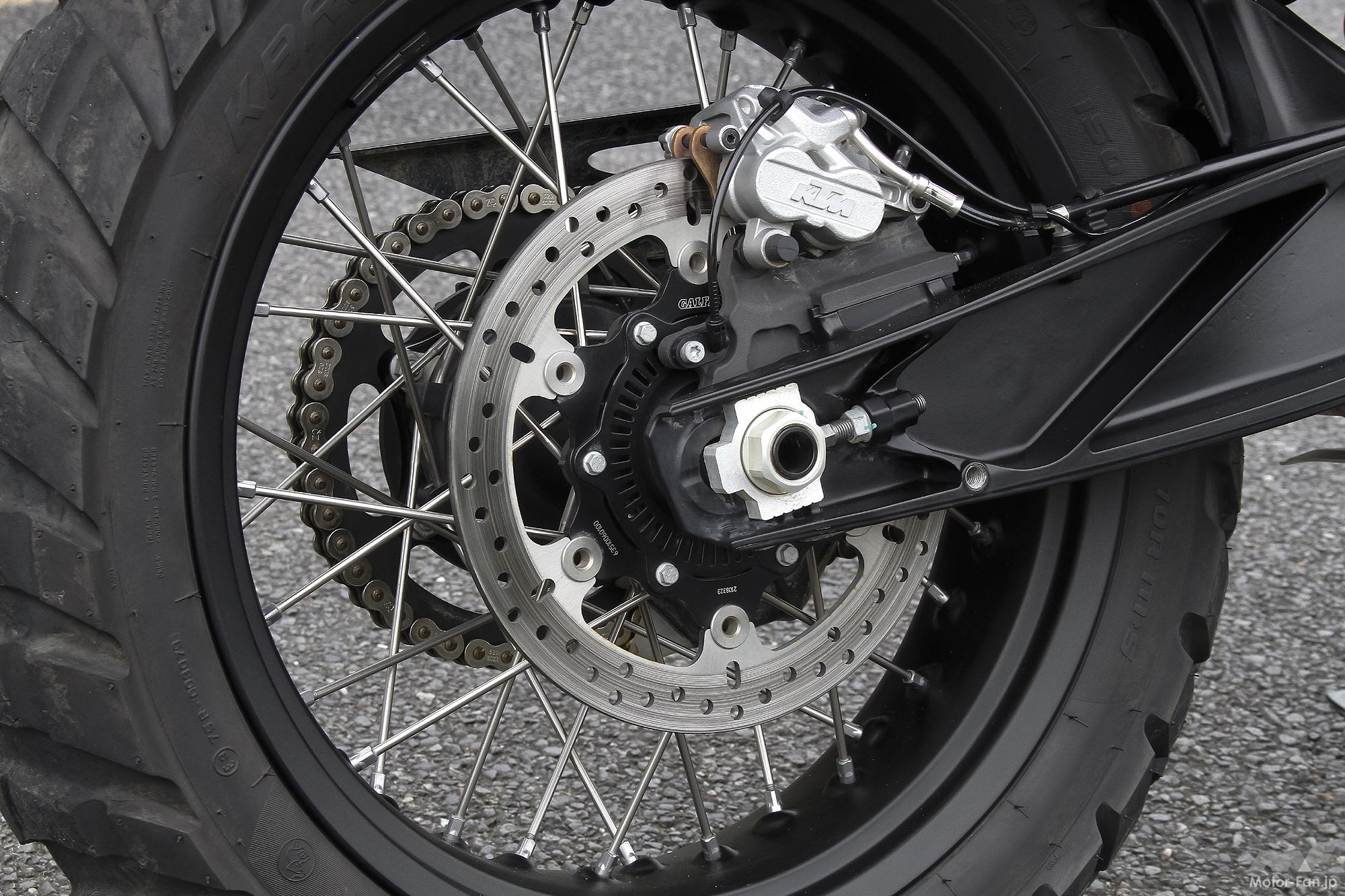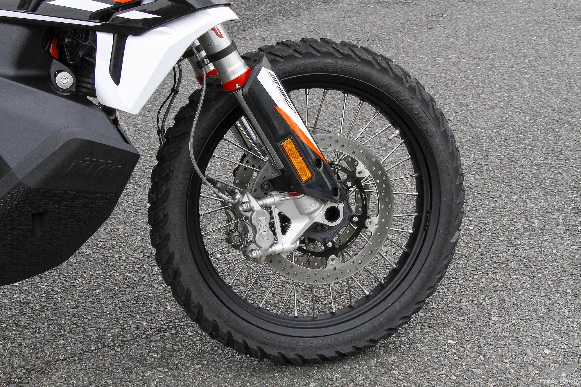 装着タイヤはメッツラー製KAROO 3。大きなブロックパターンは不整地のグリップに優れるタイプ。オフロードでのトラクション性能を大切にするなら実に強い味方となる。
