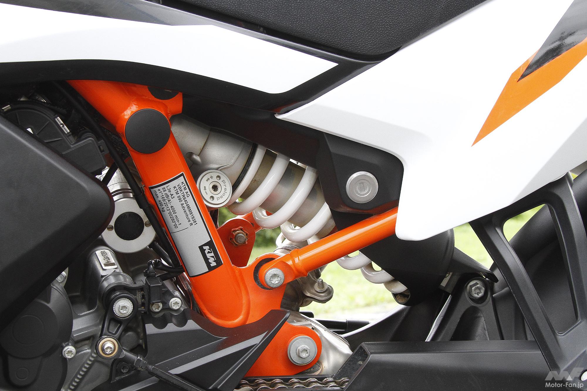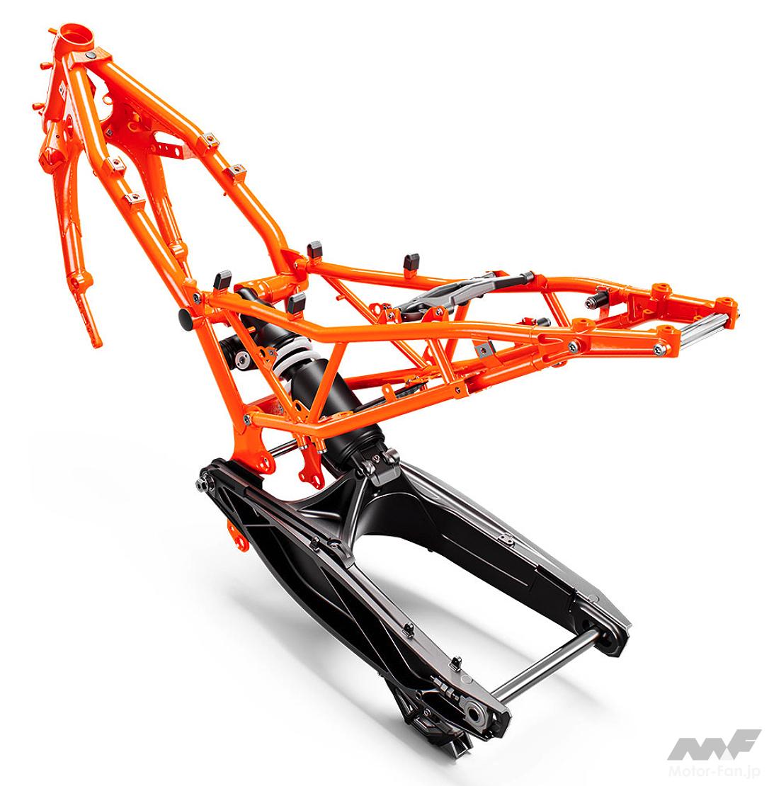 詳細は既報の890アドベンチャーと共通。クロームモリブデン鋼管フレームにエンジンをリジッドマウントする事で、車体全体での高剛性化を追求。ボルトオンされたクロモリ鋼管製リヤフレームや鋳造アルミスイングアームにモノショックを採用したシンプルなサスペンション構造も同じである。