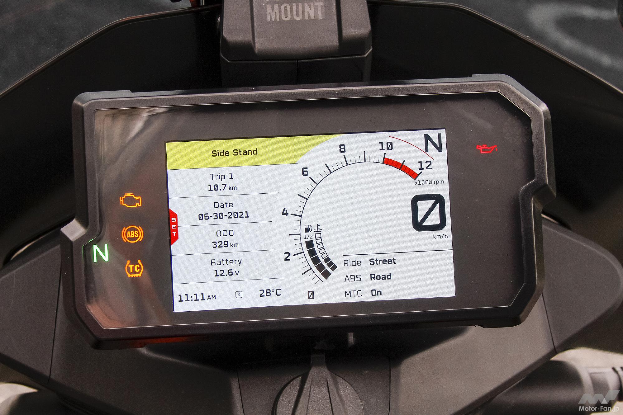 前後ブレーキも効きは強力で、かつコントローラブル。流石に制動時のノーズダイブはアドベンチャーよりも大きいが、その挙動は十分に落ち着いていた。