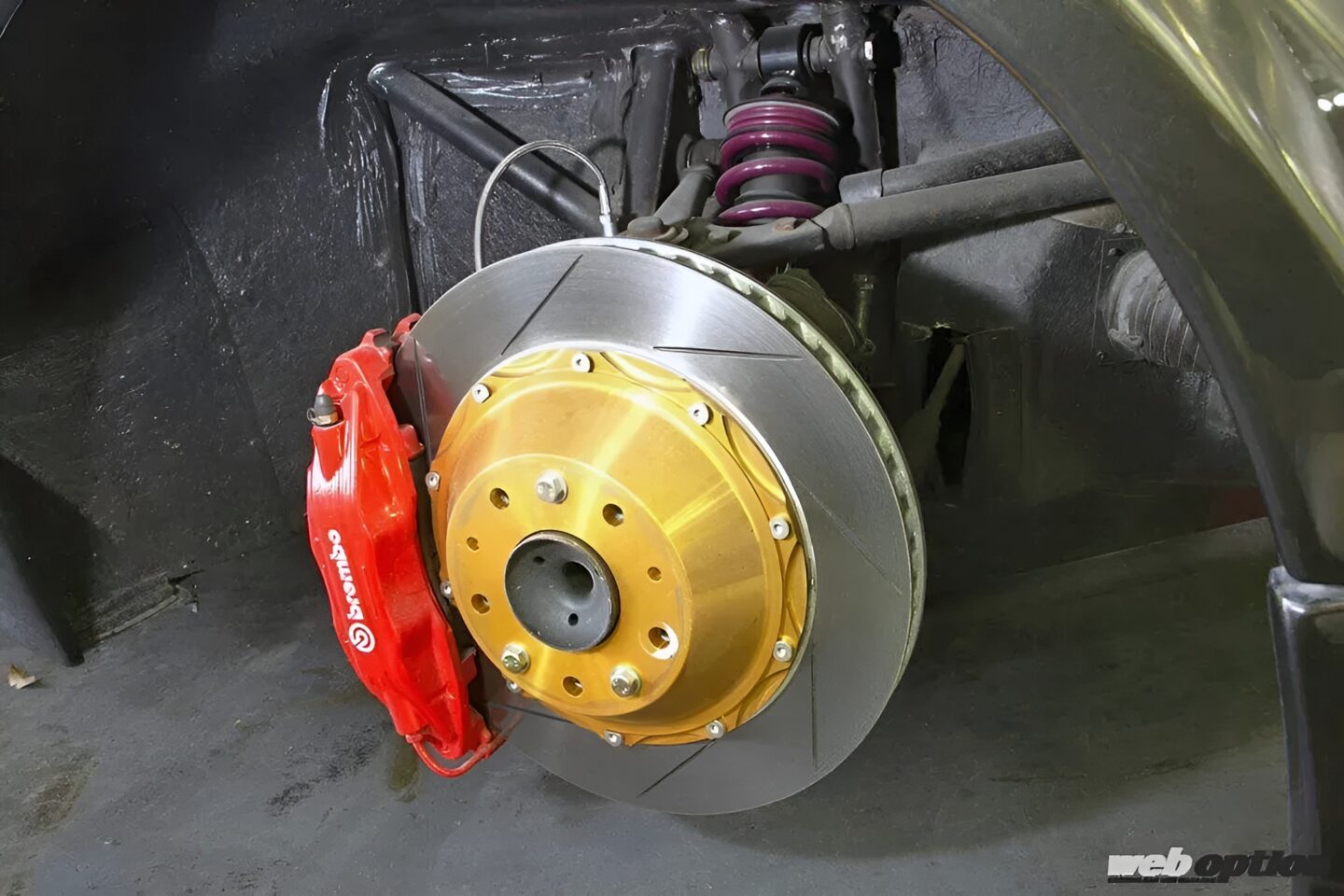 そんなエンジンに対して、足回りには何度も仕様変更を繰り返して煮つめられたアラゴスタ特注車高調が奢られている。リヤはツインダンパー式だ。バネレートはフロント14kg/mm、リヤ8kg/mm×2本。また、ブレーキは前後ともブレンボF50キャリパー+355mmローターで、リヤにはサイドブレーキ用キャリパーも設けられる。制動力は抜群で、初期からカチッと効いてくれる。