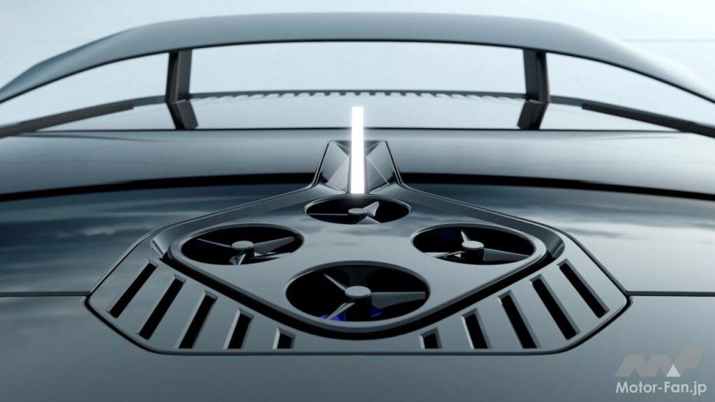 中央のディスプレイにはバッテリーと充電インジケーターが表示され、レイアウトはハイブリッド技術を強く示唆している。当初は完全電気自動車と思われていたが、量産型では電動アシストと新型V8エンジンを組み合わせる可能性が高くなってきた。