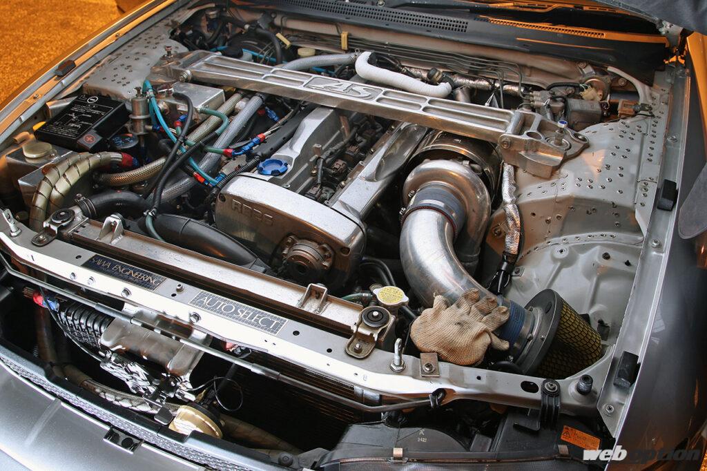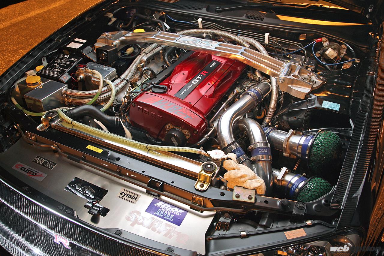 全回転域で驚異的なパワーを発生させるエンジンは、RB26改3.0LのGT3037Sツインターボ仕様で、もはやRB26パワーチューンの究極系と言っても過言ではないスペックを持つ。常用ブースト1.25キロ、一発狙いで2.05キロまでかければ、出力は1000psの大台を突破するほどだ。(OPTION誌2009年1月号より抜粋)