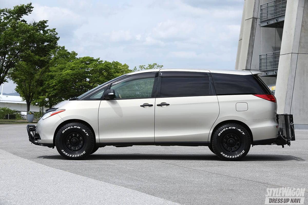 足元を見ればホワイトレターのオフタイヤを装着。実は車高を4インチアップしたアゲエスティマなのだ。