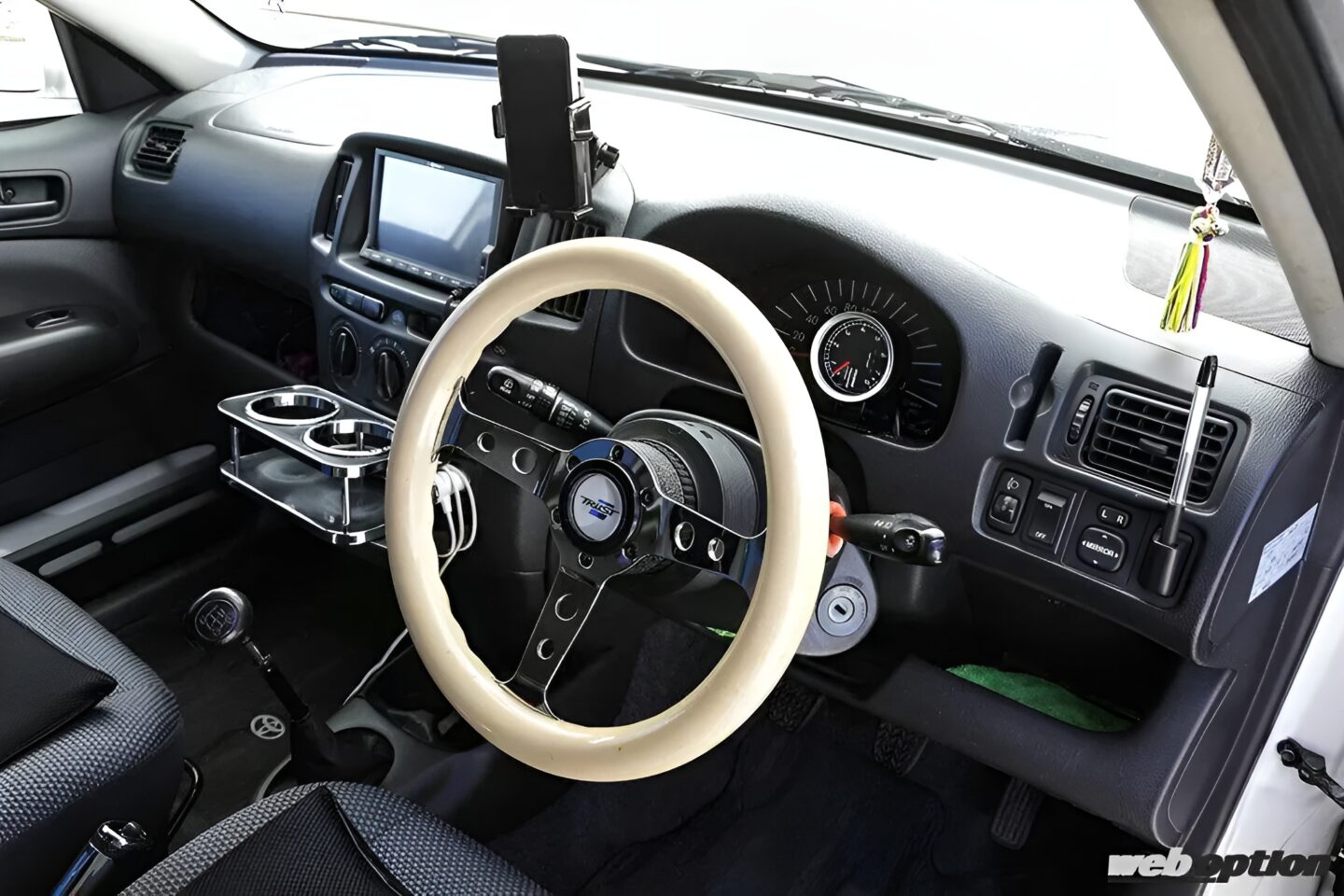 ホワイト好きなオーナー、ステアリングはカー用品店で入手した320φに交換。シフトノブは運転席側に寄せられるタイプへと変更されている。また、センターコンソールにテーブルを設けるなど、実用性重視の内装メイクだ。