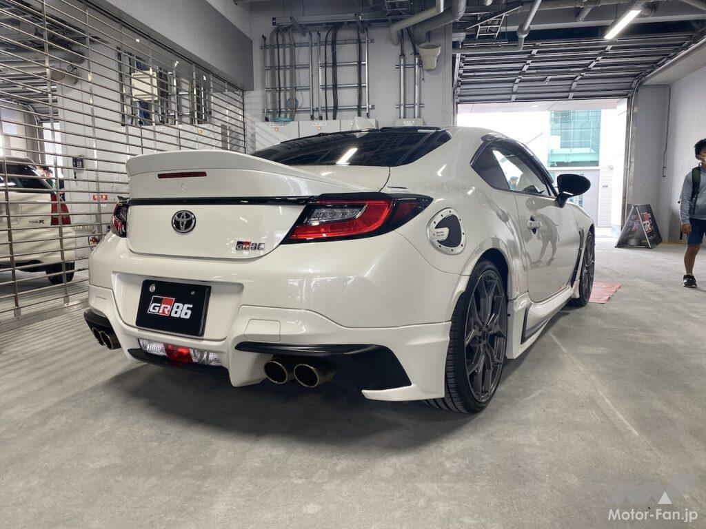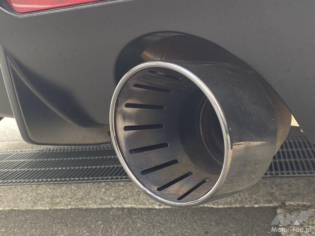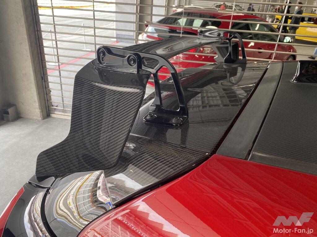 フロントからリヤにかけて炭素繊維強化樹脂(CFRP)を用いたエアロを装備。そのほかアルミニウム鍛造1ピースの19インチホイール、110mmもの大径が目を引くGRスポーツマフラーを装着していた。