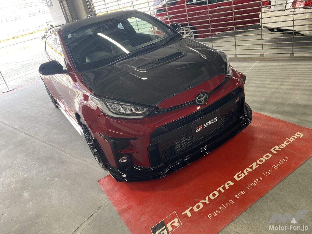 TGRレーシングドライバーを務める大嶋和也氏とともに鍛え上げたGRMNヤリスの思想をそのままに、GRヤリス向けにチューニングしたアイテムが装着される。具体的にはフロントスポイラー(6万6000円)とサイドスカート(5万8300円)、さらには2023年内に発売を予定しているGRカーボンフードとGRカーボンリヤウイングも装着。内装ではRECARO社製のGRフルバケットシート(35万9700円:2023年内発売予定)が備わっていた。