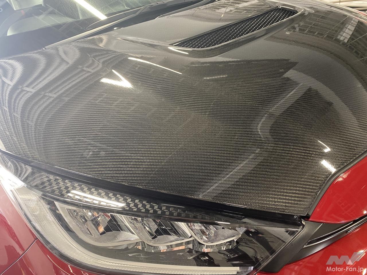 フロントからリヤにかけて炭素繊維強化樹脂(CFRP)を用いたエアロを装備。そのほかアルミニウム鍛造1ピースの19インチホイール、110mmもの大径が目を引くGRスポーツマフラーを装着していた。