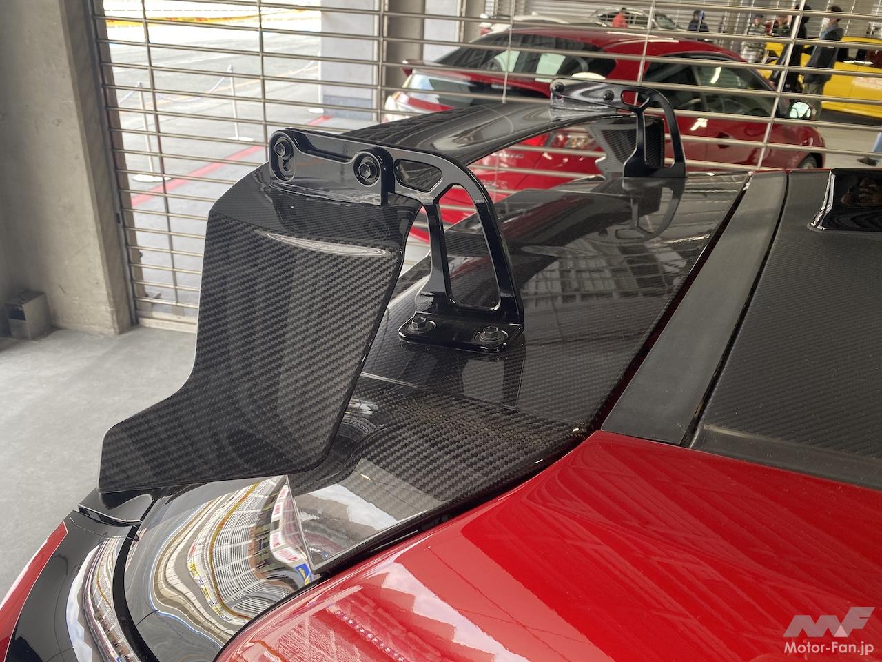 TGRレーシングドライバーを務める大嶋和也氏とともに鍛え上げたGRMNヤリスの思想をそのままに、GRヤリス向けにチューニングしたアイテムが装着される。具体的にはフロントスポイラー(6万6000円)とサイドスカート(5万8300円)、さらには2023年内に発売を予定しているGRカーボンフードとGRカーボンリヤウイングも装着。内装ではRECARO社製のGRフルバケットシート(35万9700円:2023年内発売予定)が備わっていた。