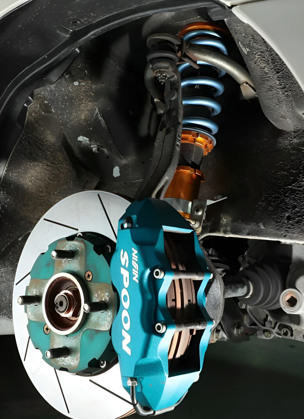 足回りはブッシュ類をリフレッシュしつつ、ハンドリングと乗り心地を考慮して仕上げられたアスランのオリジナル車高調(F18kg/mm R16kg/mm)でセットアップ。フロントはスプーンのキャリパー、リヤは98スペック純正を流用してブレーキ性能も高めている。