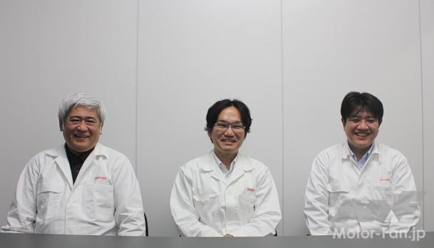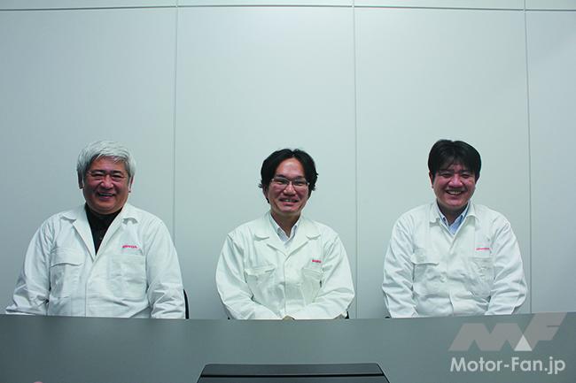 【左】デザイナー立石 康さん(本田技術研究所)2000年代のNプロジェクトの主要人物。近年はクラシックウイングマークシリーズに関与。【中央】LPL石田慎一郎さん(本田技研工業)専門分野は車体設計/開発で、排気量や分野を問わず、これまでに数多くの車両を担当。【右】広報内山史朗さん(ホンダモーターサイクルジャパン)価格や上級仕様に関する疑問に答えてくれた内山さん。広報・モータースポーツ課のチーフ。