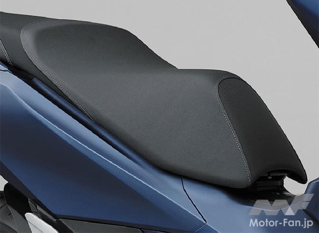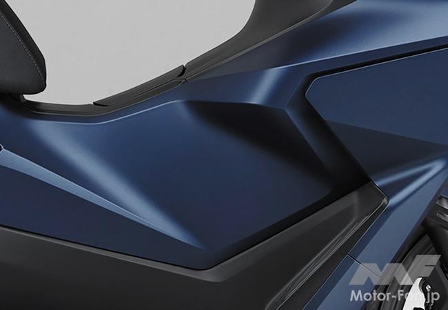 石田:外装に関しては、四代目から内部部品の配置を見直したことにより、フロントサイドカバーの左右幅を狭めることができ、足元の防風性能を損なうことなく開放感も両立させました。具体的には、フロアに足を乗せた際にスネのあたりとつま先のスペースが広くなっているのを感じて頂けると思います。