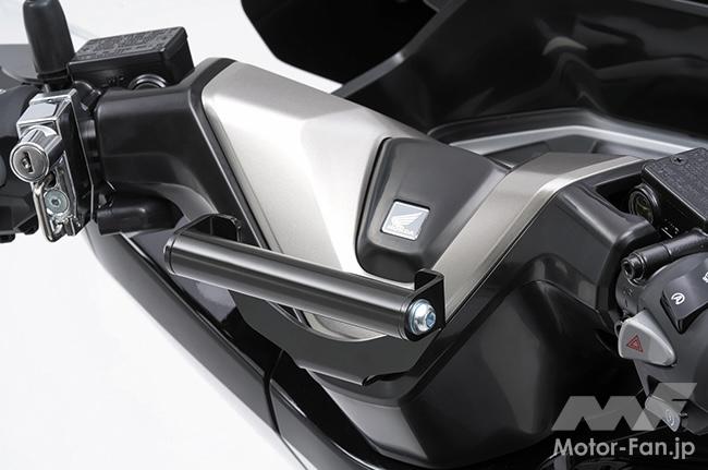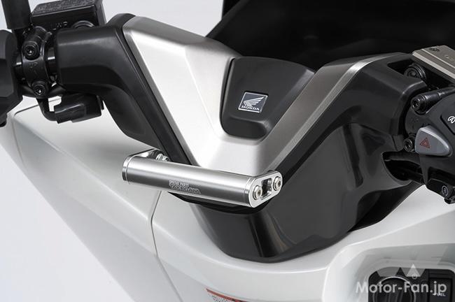ハンドルバーの構造変更によって、スマホやカメラなどの装着が難しくなった2025年型PCXだが……。アフターマーケットパーツを使用すれば、既存のPCXシリーズと同様にさまざまなガジェットの装着が可能になる。