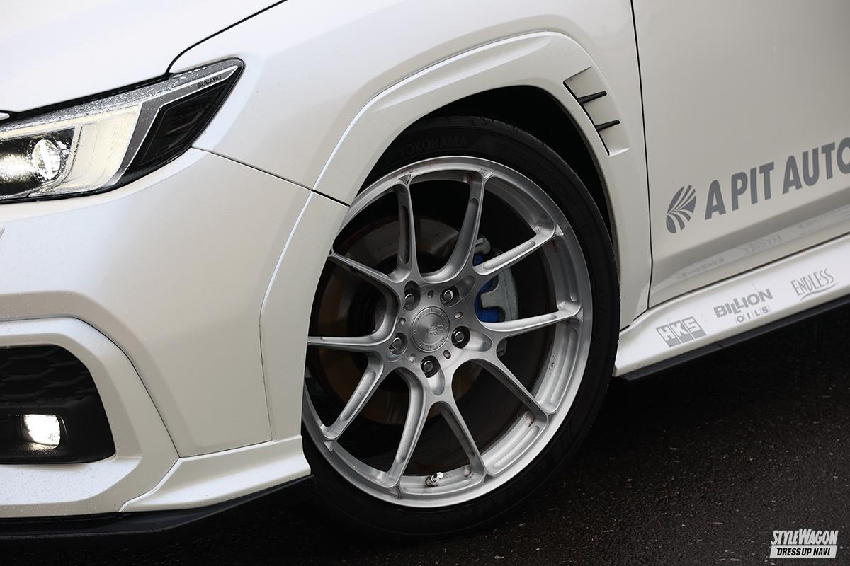 スモーク仕様の前後エンブレムなど、ドレスアップ面でも〝違い〟がアピールできる体勢が整う。さり気なく、光や見る角度で色が変わって見える大人な色味のラッピングを施すなど、カスタム面も参考になる。現状、VB系WRXのチューニング、カスタムはまだスタートしたばかり。だけどA PITのWRXを見ていると、今後確実に加速しそうな予感がする。