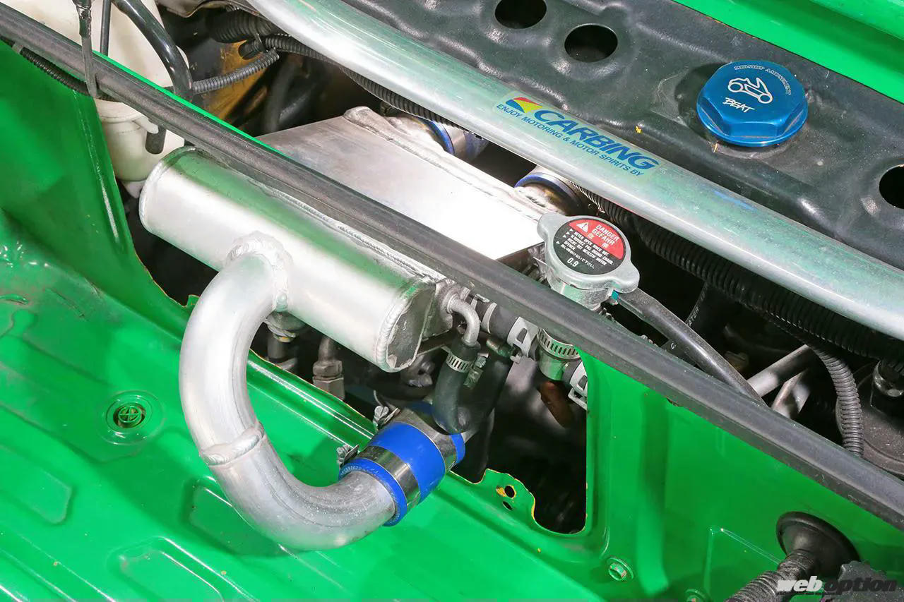 ビートはミッドシップというレイアウト上、インタークーラーやオイルクーラー等にフレッシュエアを効率良く導入するのが難しい。そのため、両パーツは一般的な空冷式ではなくワンオフの水冷式としているのもポイントだ。ラジエターは、純正位置にアルミの大容量タイプをインストールする。