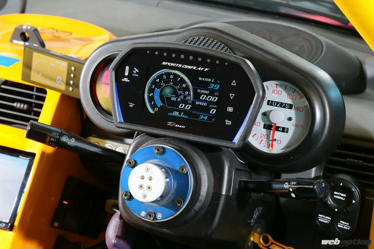 非常にタイトな室内だが、センターコンソールが助手席側にオフセットされた設計のため、運転席側にはレカロのRSMが装着可能なスペースを持っている。メインメーターにはデフィのオールインワンモデル「スポーツクラスター」で集中管理。エンジンマネージメントはフルコンのLINKが担う。